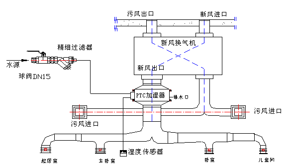 工作原理: 新風(fēng)換氣機(jī)是一種帶有高效熱回收器、風(fēng)機(jī)和空氣過(guò)濾器,具有雙向換氣、空氣凈化及熱回收功能的通風(fēng)設(shè)備。 新風(fēng)換氣機(jī)系列加濕器的工作原理是利用PTC電陶瓷加熱而產(chǎn)生的蒸汽輸送到新風(fēng)換氣機(jī)的室內(nèi)新風(fēng)送風(fēng)口處,完成新風(fēng)加濕過(guò)程 。